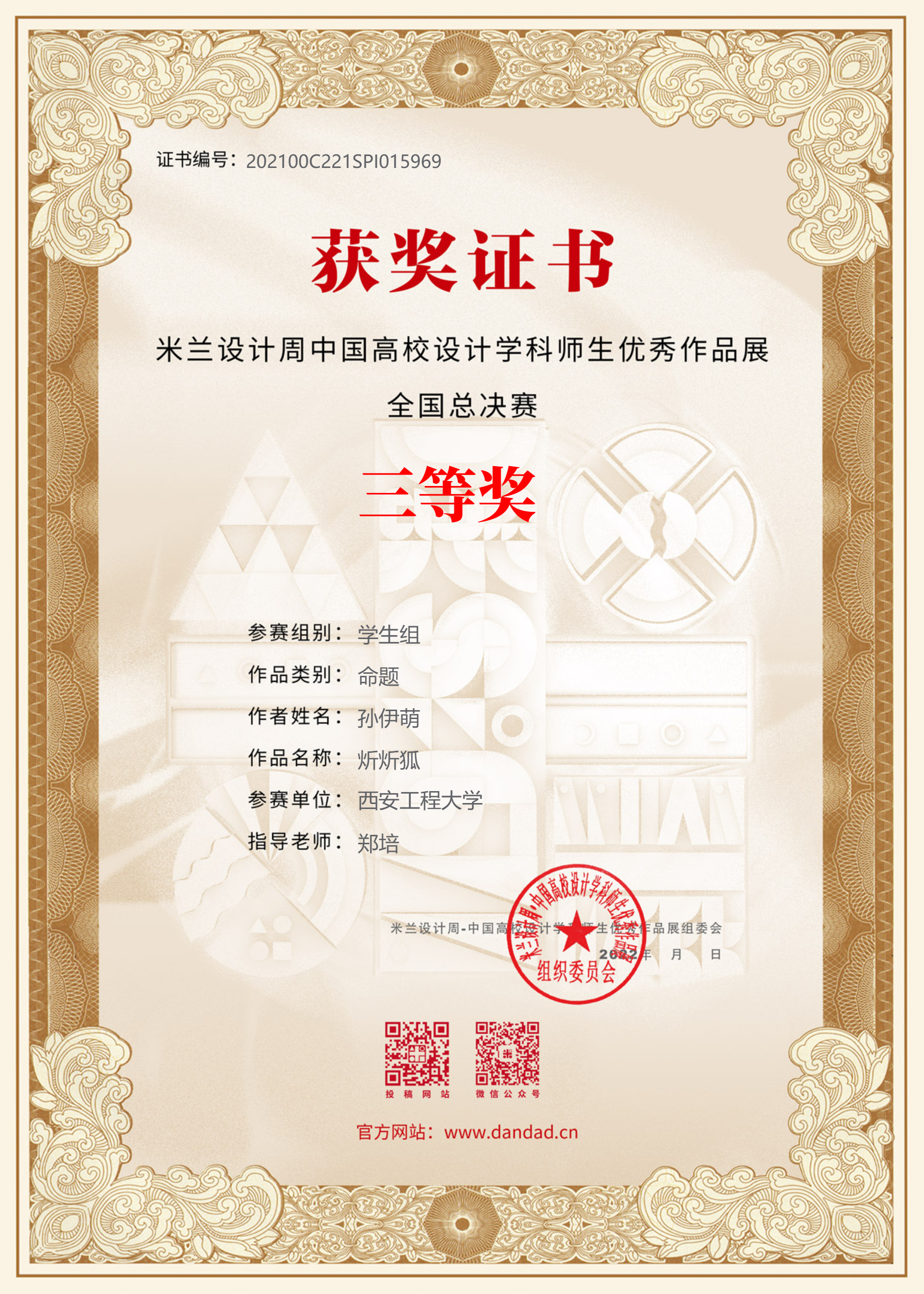 近日,2022“米兰设计周—中国高校设计学科师生优秀作品展”命题赛获奖名单发布,米高梅 2021级设计学类3班孙伊萌同学作品《炘炘狐》获得全国总决赛三等奖。