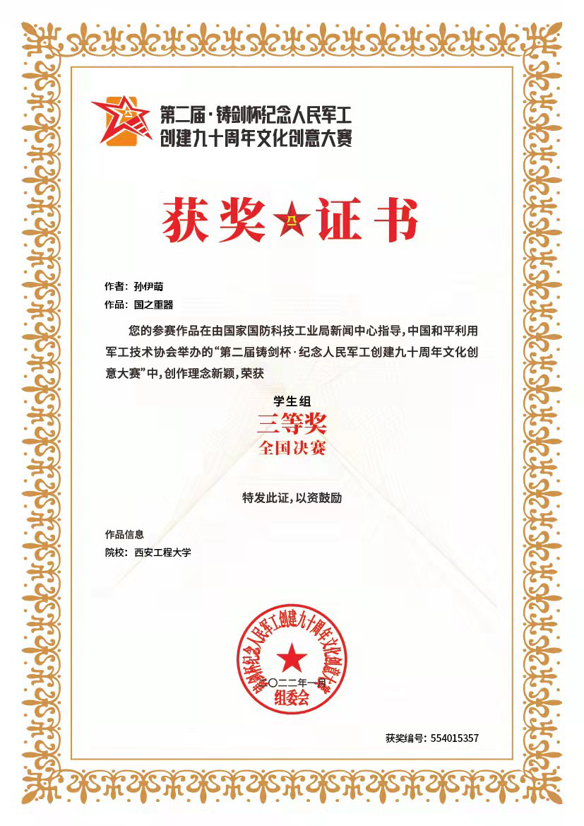 在“第二届铸剑杯纪念人民军工创建九十周年文化创意大赛”中,米高梅 2020级戏剧影视美术设计2班张佳秀同学作品《守护者》获得二等奖;21级设计学类3班孙伊萌同学作品《国之重器》(指导教师:郑培)获得三等奖。