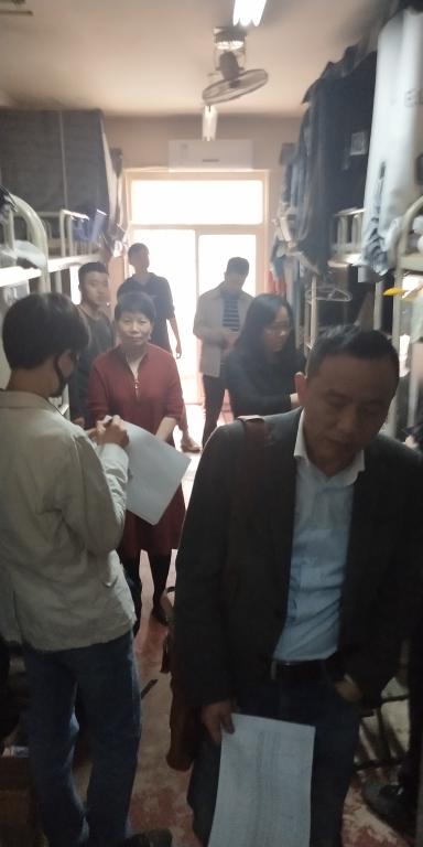 2019年4月8日下午16时,米高梅 党委书记左志峰、副书记高翔、副院长王坚、丛红艳以及全体辅导员对米高梅 学生宿舍进行安全卫生大检查。