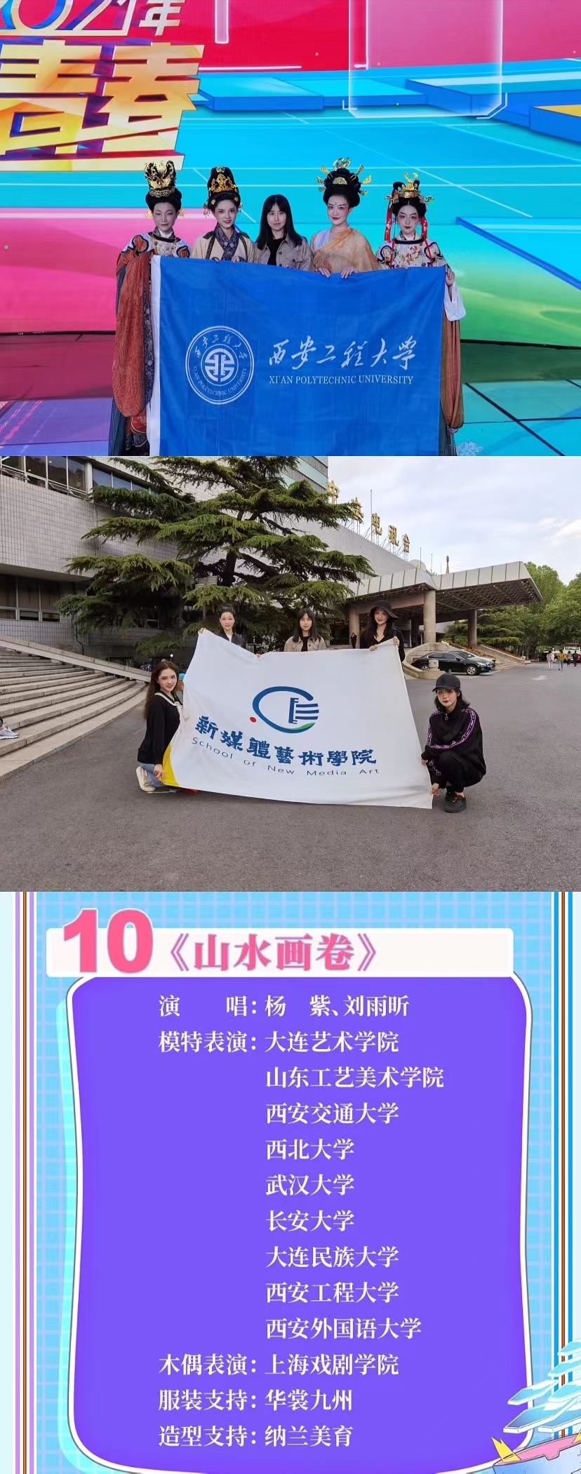 中央广播电视总台《奋斗正青春——2021年五四青年节特别节目》于5月4日晚黄金时间在CCTV-1、CCTV-3、央视频、央视文艺客户端和央视影音联合播出。米高梅 的四位学生参演了《山水画卷》节目的录制,与杨紫,刘雨昕同台演出!