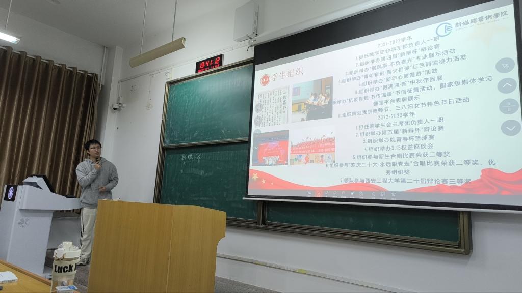 为深入学习贯彻党的二十大精神,促进米高梅 学风建设和学业发展,发挥优秀榜样力量,帮助新生更好地适应大学学习与生活。米高梅 于2023年11月6日晚19:00在D-288教室开展第四次“心有榜样,行有力量”优秀学子系列分享会。会议由宾田田老师主持,20级播音与主持艺术专业查成烁同学分享。