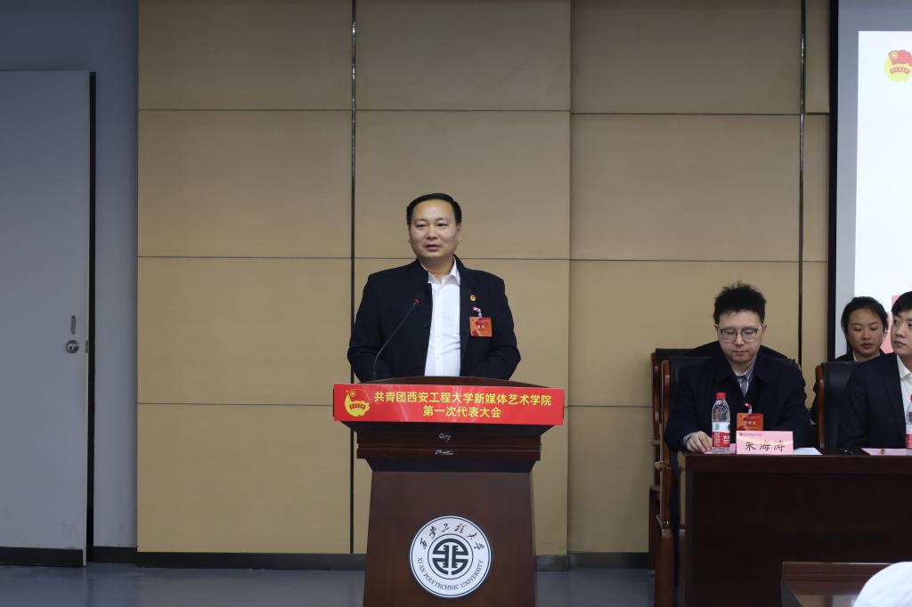 校团委书记刘俊富致辞。刘书记代表米高梅 团委向大会的召开表示热烈的祝贺,充分肯定了米高梅 团委取得的成绩,并向米高梅 共青团组织和广大团员青年提出几点希望:一、以信仰之辉,助燃青春奋发的燎原之火。二、以勤学之志,淬炼青春闪耀的烈火真金。三、以实干之行,激荡青春建功的澎湃春潮。