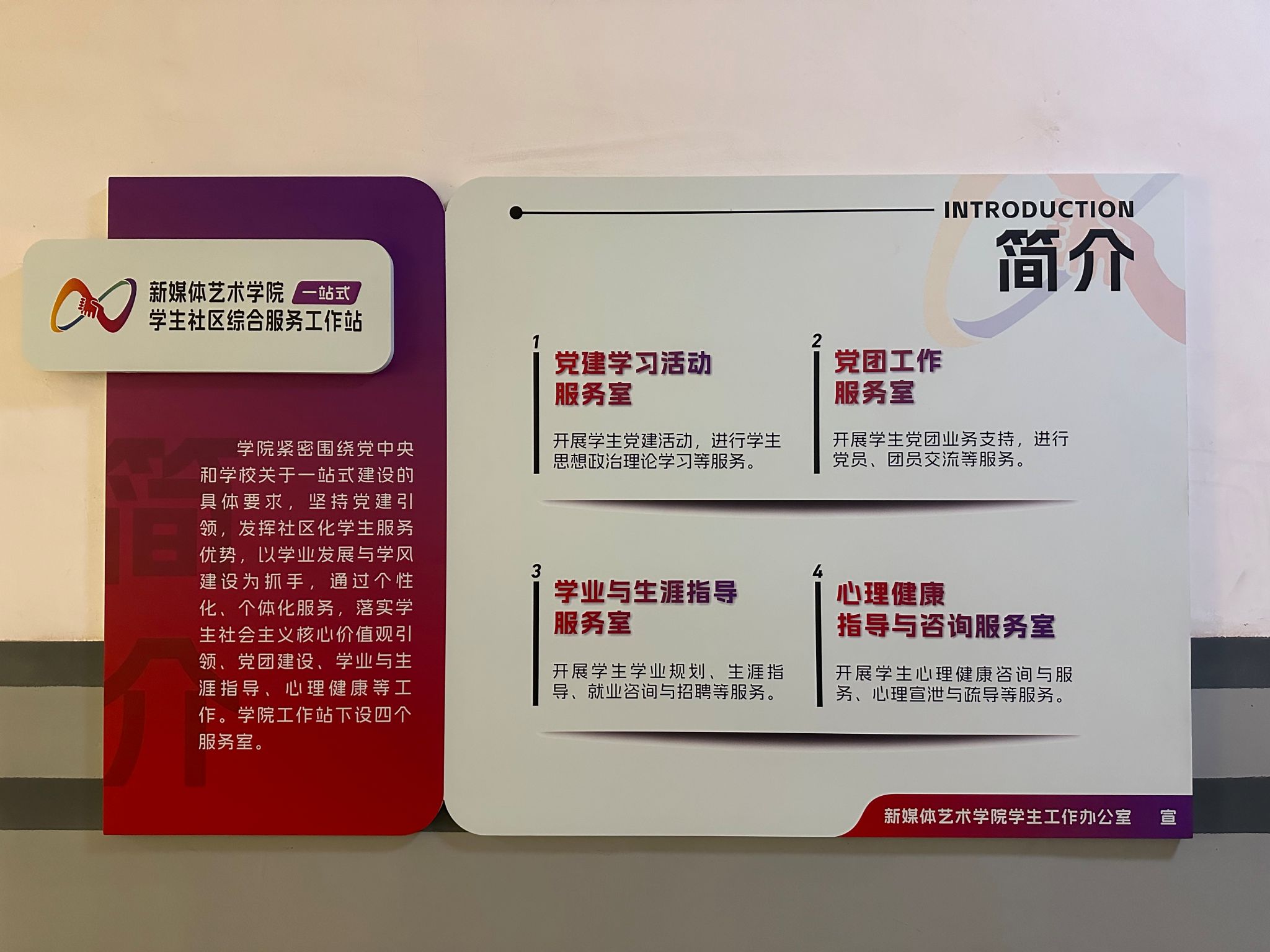 米高梅 利用现有场地资源,开展“一站四室”建设和运行,即:米高梅 “一站式”学生社区综合服务工作站——党建学习活动服务室、党团工作服务室、心理健康指导与咨询服务室、学业与生涯指导服务室。