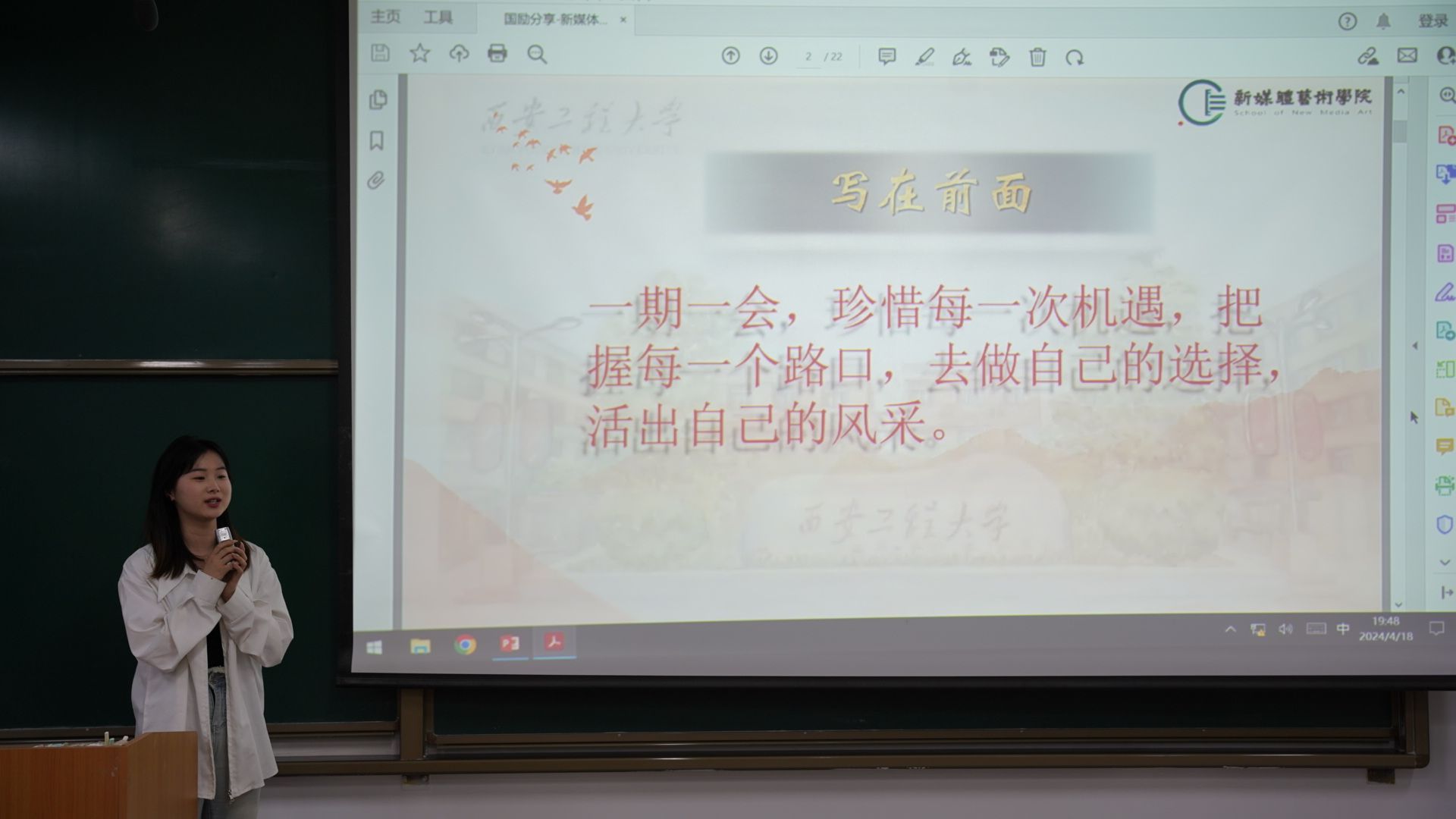 朋辈引领促成长,领航青春共进步。为进一步完善学生资助政策,发挥米高梅 一站式学生社区作用,全面深化资助育人成效,助力学生全面发展,引导受助的同学用实际行动践行青春誓言,用奋斗充实青春底色,让同学们常怀感恩之心、健康快乐成长。米高梅 于2024年4月18日19:00在临潼校区D栋286教室成功开展“心有榜样,行有力量——感恩励志分享会”活动。会议由王奕睿同学主持,国家奖学金获得者陈淼、国家励志奖学金获得者闫欢欢、王娟三位同学分享,宾田田老师及2023级广播电视编导专业全体同学参加。
