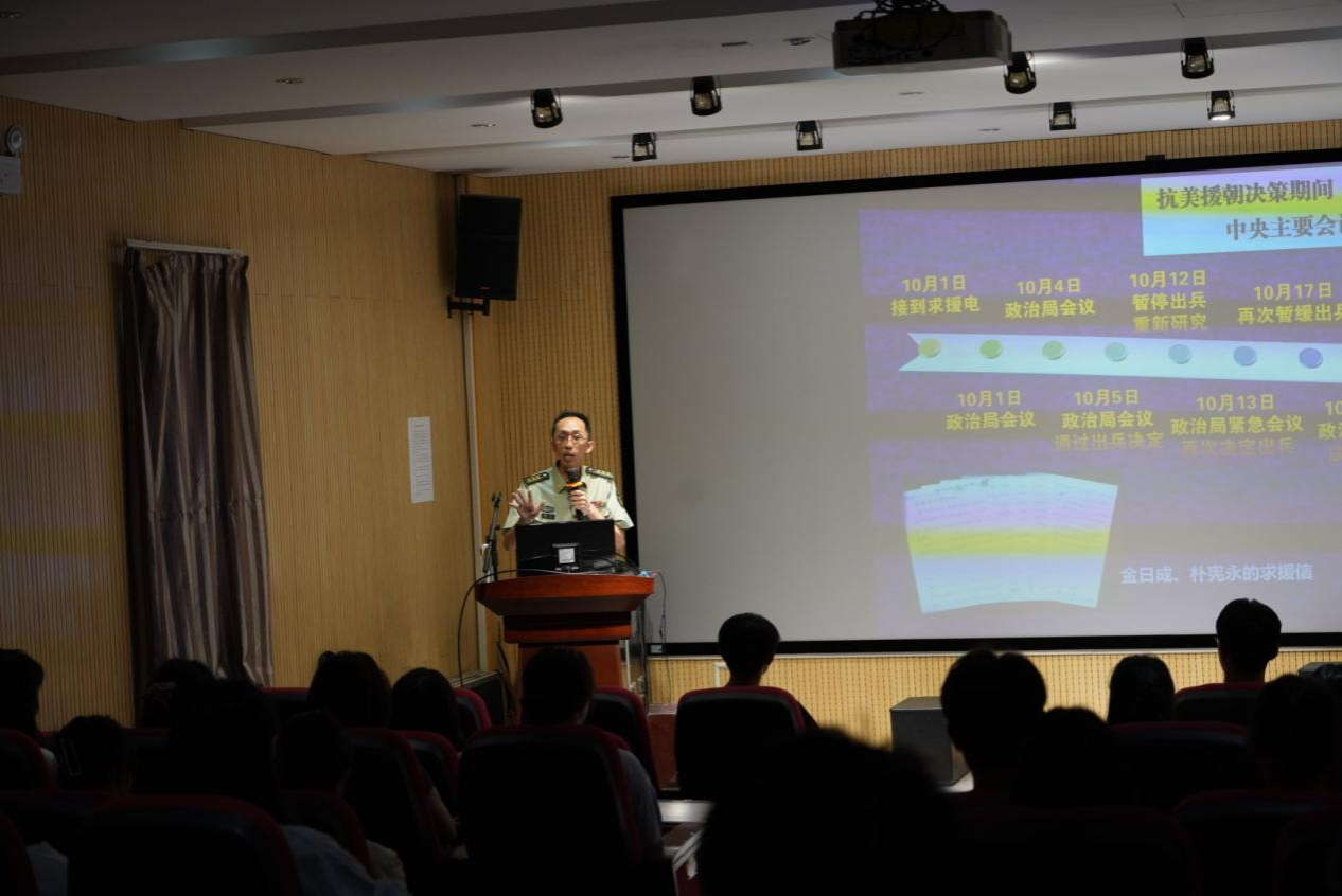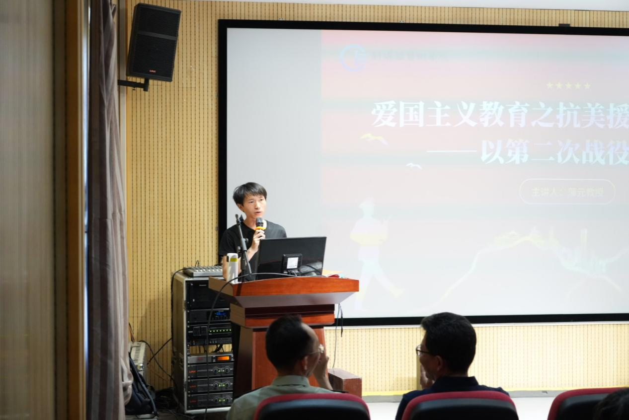 蒲教授介绍了抗美援朝战争的概况,从时代背景深入剖析,讲述了朝鲜半岛战火对我国国家安全和发展的危害,分析了中央作出抗美援朝决策的原因:抗美援朝既是对社会主义邻国朝鲜的支援,也是对我国东北地区建设安全的重要保障,同时打击美军侵略的嚣张气焰,保障国家安全。