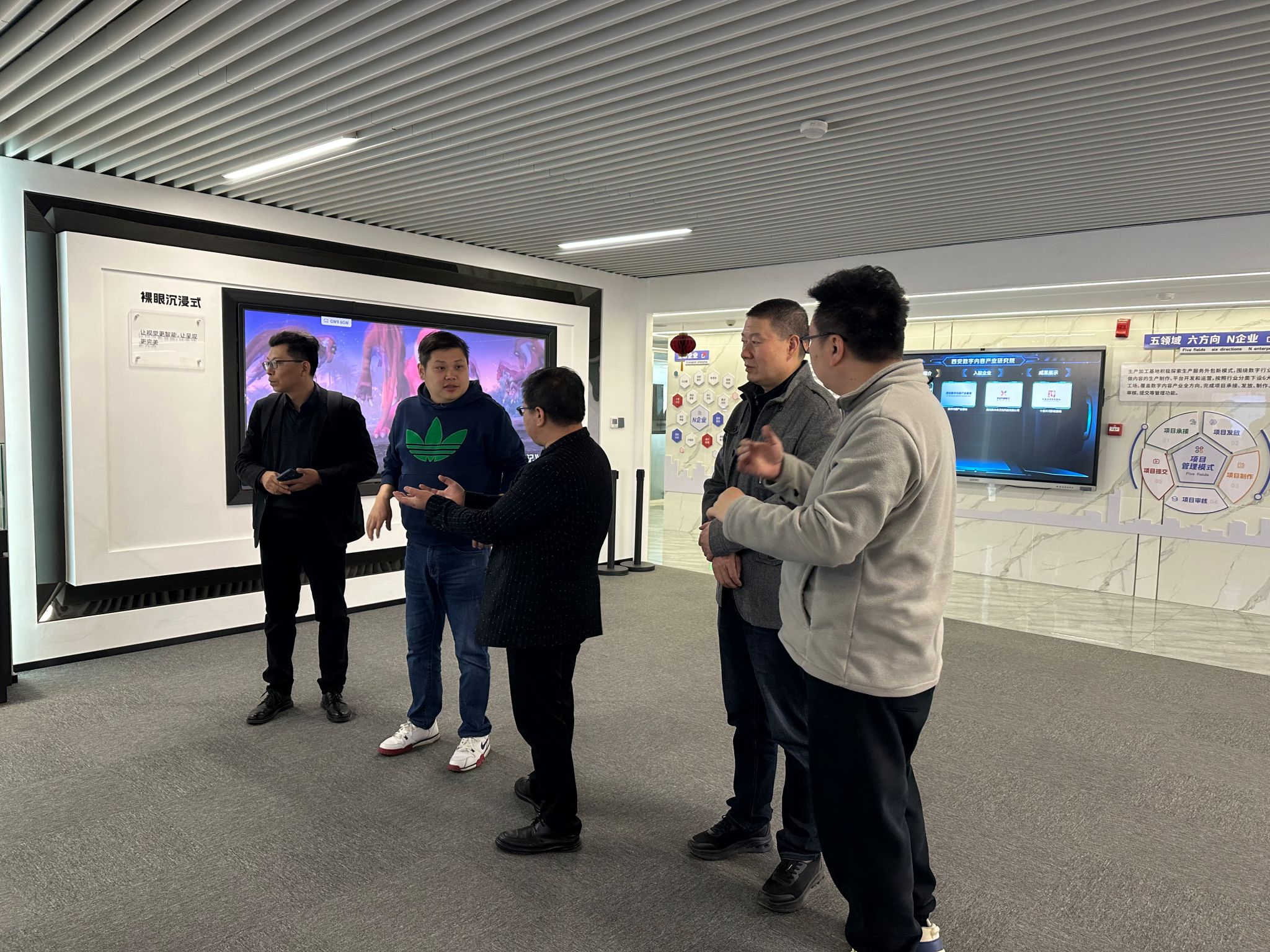 调研组一行在西安数字内容产业研究院产学研教育服务中心主任李凡的引导下,先后参观了企业展厅、沉浸式VR大空间体验馆、短剧拍摄场景等,深刻感受到数字技术对内容生产的巨大变革。现场交流过程中,双方就产学研协同育人、“实践+就业”等模式进行了深入探讨,并初步达成了一些合作意向。