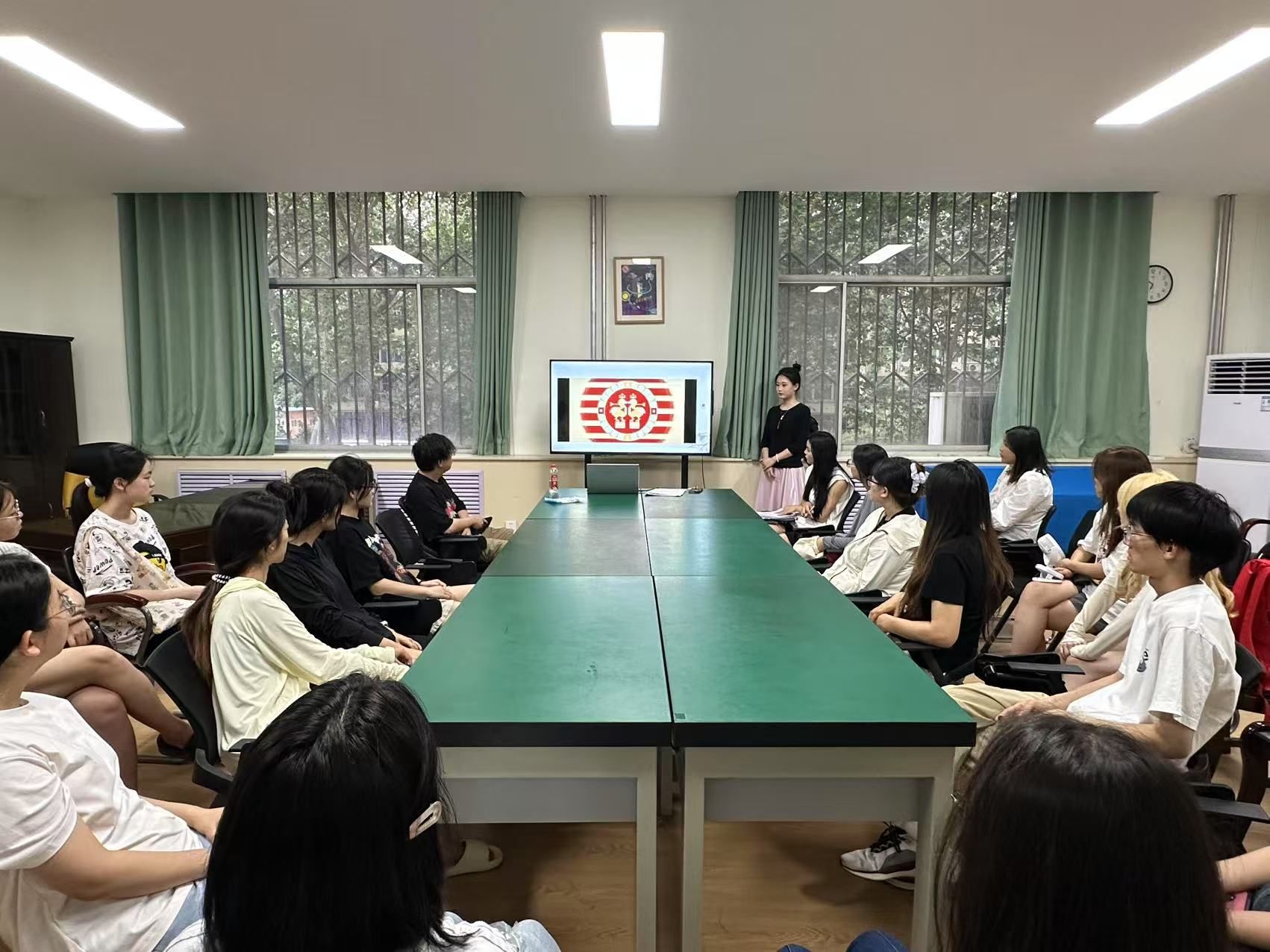 分享会从初唐到晚唐的历史脉络展开,张露丹以生动的讲述勾勒出唐制汉服的演变轨迹:初唐女子着窄袖襦裙,利落飒爽;盛唐兴起诃子裙、大袖衫,尽显雍容自信;晚唐服饰趋向华丽繁缛,层层裙摆如绽放的花影。一段复原唐制服饰的视频让同学们仿佛穿越至长安街头,仕女们织金锦裙曳地、广袖揽月的画面,引得同学们频频惊叹。