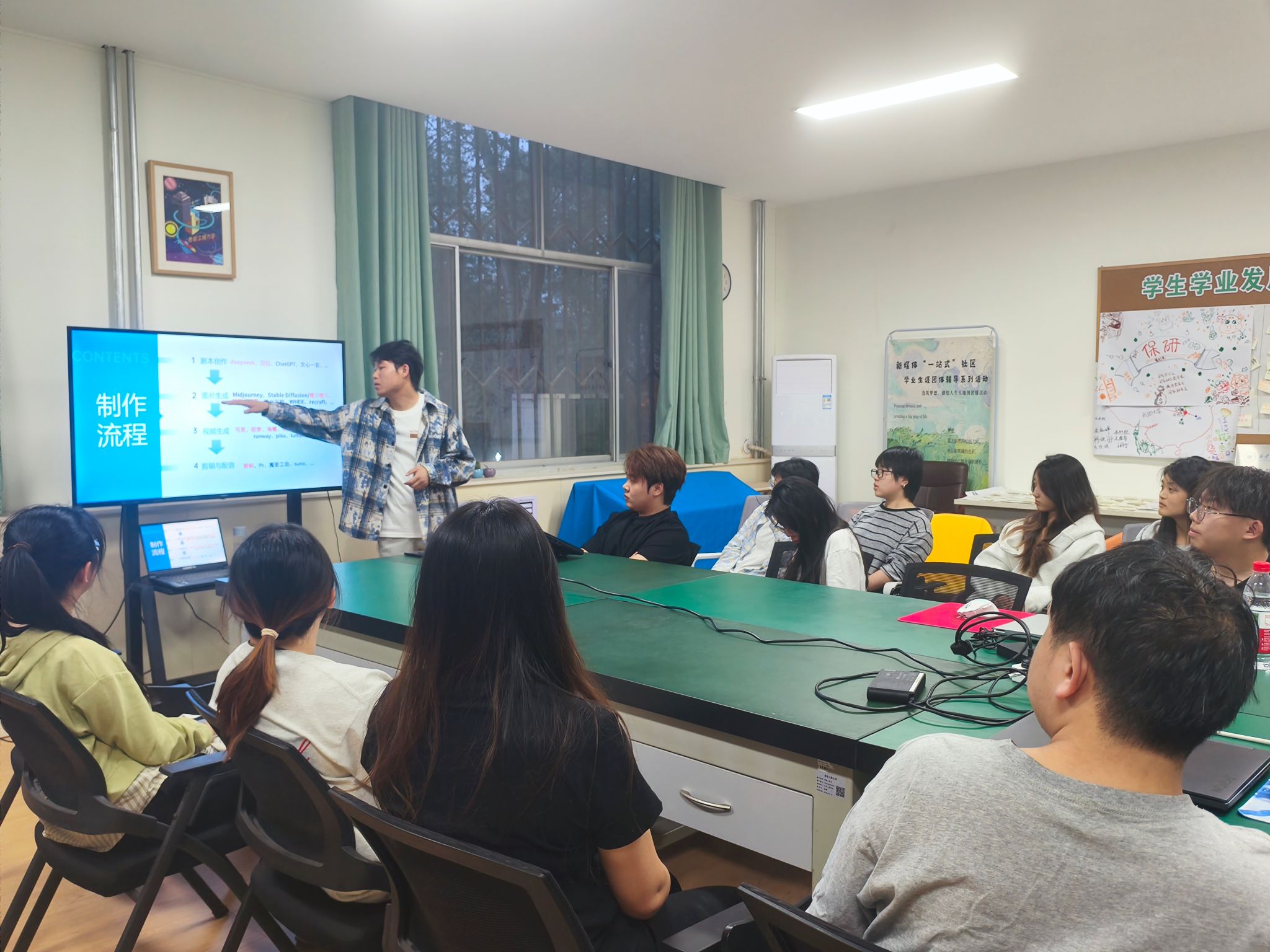 课堂鼓励受助学生作为分享者,将自己的收获、认识与成果分享给广大学生群体。其中,广播电视编导专业学生围绕电影审美主题,开展经典电影交流会;播音与主持艺术专业学生围绕专业开设发声、模拟新闻发布会、纪录片配音、直播带货等场景,帮助同学们提升不同语境下的语言表达技巧;动画、戏剧影视美术设计专业学生围绕美术基础,“AI×Design”创意、游戏制作等向非专业学生分享AI绘图工具(如MidJourney/Stable Diffusion)在平面设计、视频制作、服装设计中的全流程应用,激发同学们对于AI学习的兴趣。同时为深化美育育人成效,米高梅 积极整合校内外优质资源,与源点西部电影展战略合作共建“高校大学生电影展”平台,通过拓展专业实践场域与行业交流渠道,有效构建起“资源导入-平台赋能-成长输出”的美育培养生态。
