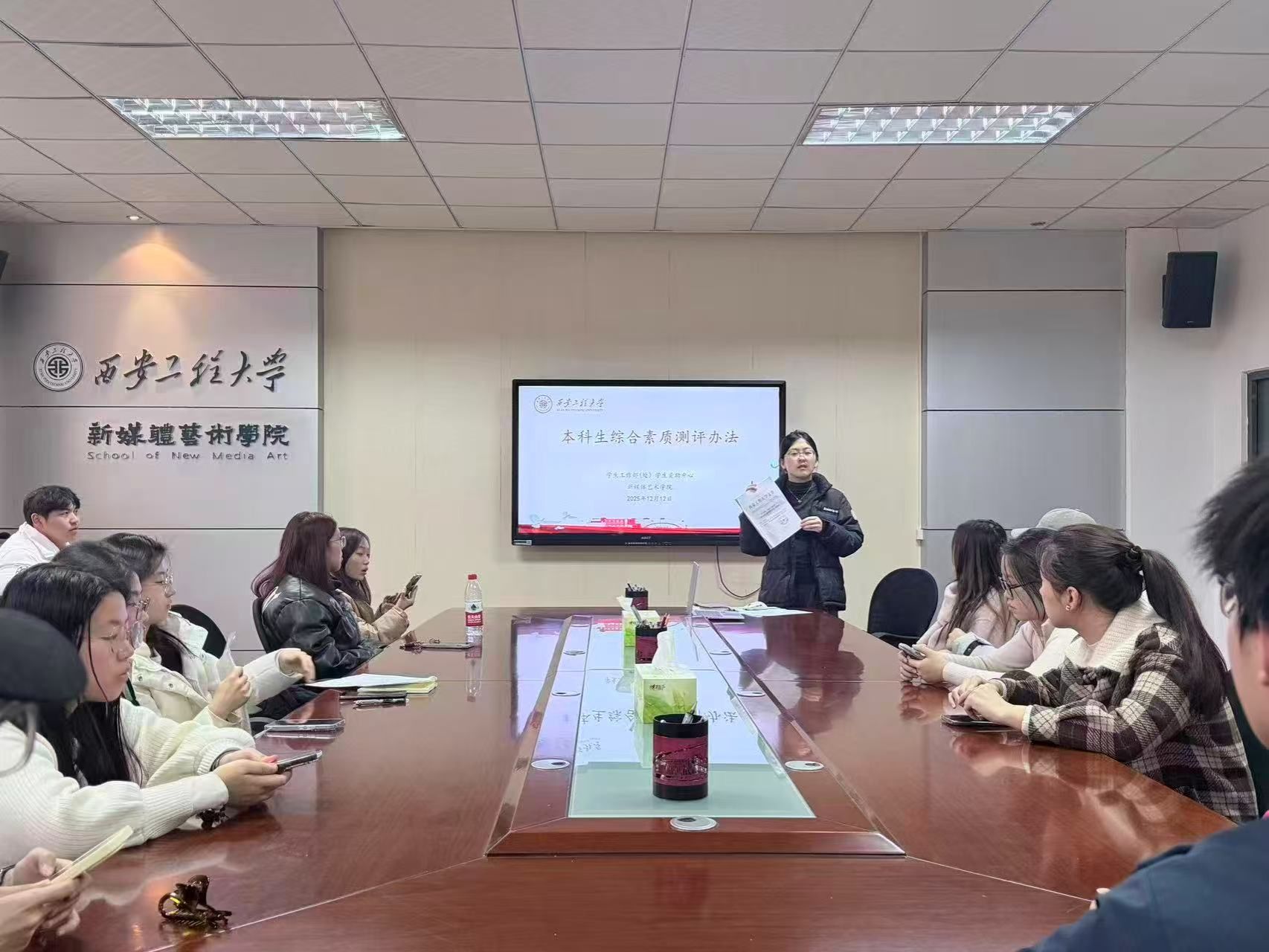 为确保测评过程的公平、公正、公开,培训还详细说明了班级评议小组的组建与职责、材料审核的关键节点以及公示反馈的全流程要求。宾田田通过结合实例与现场答疑,有效提升了各位同学对政策的理解深度与实际组织能力,为后续班级层面有序、高效地开展测评工作奠定了坚实基础。