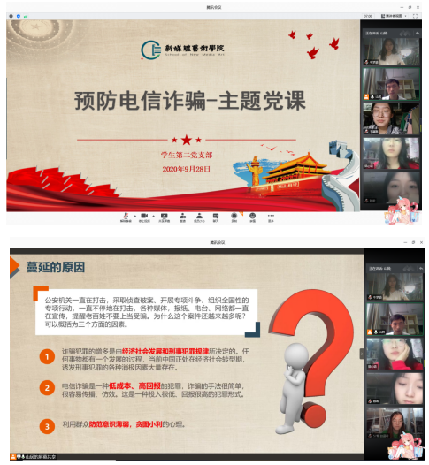 2020年9月28日,米高梅 学生第二党支部通过腾讯会议平台开展“预防电信诈骗”线上主题党课教育活动,会议由支部书记刘东欢主持,支部全体党员参加了此次活动。