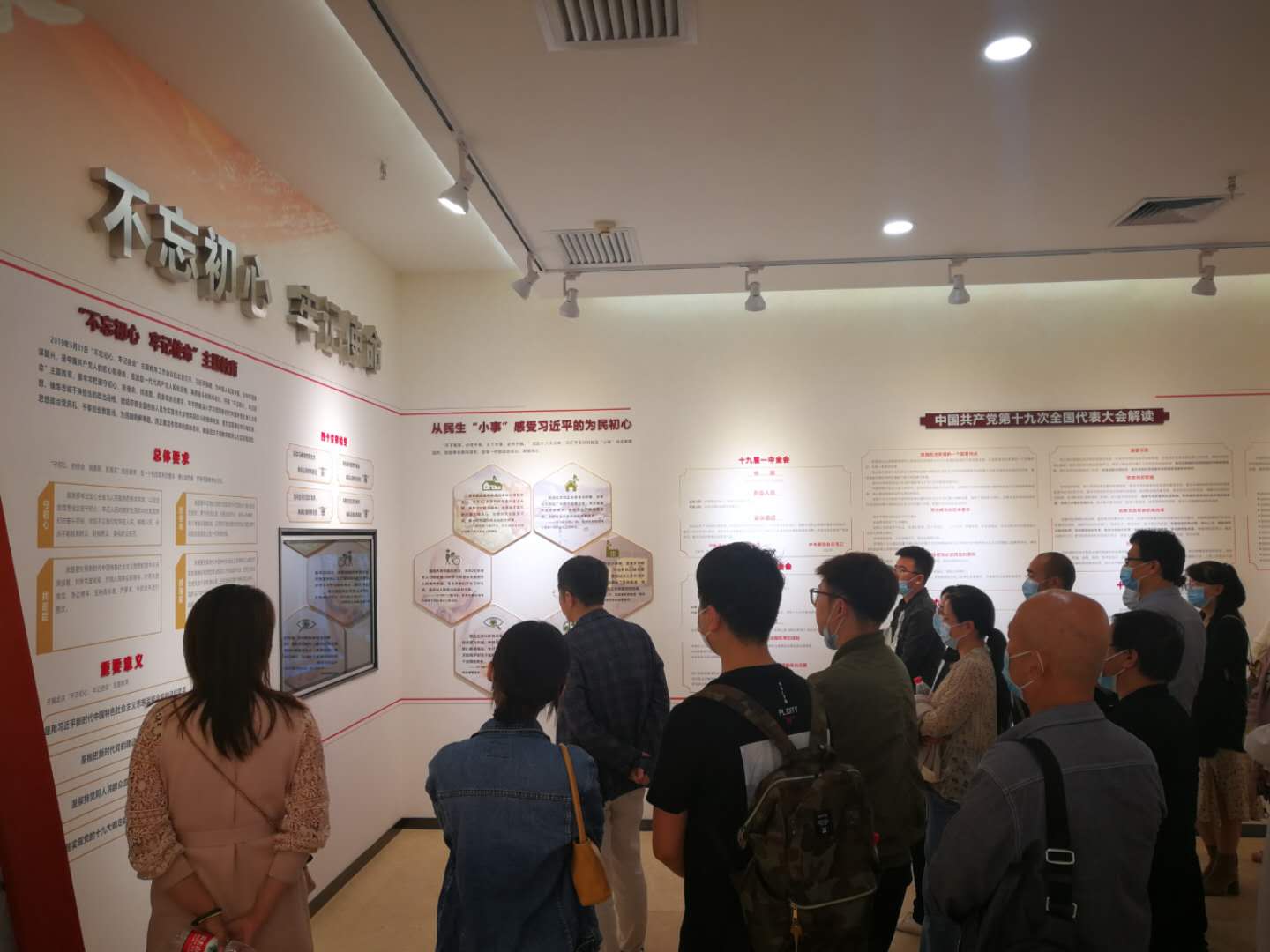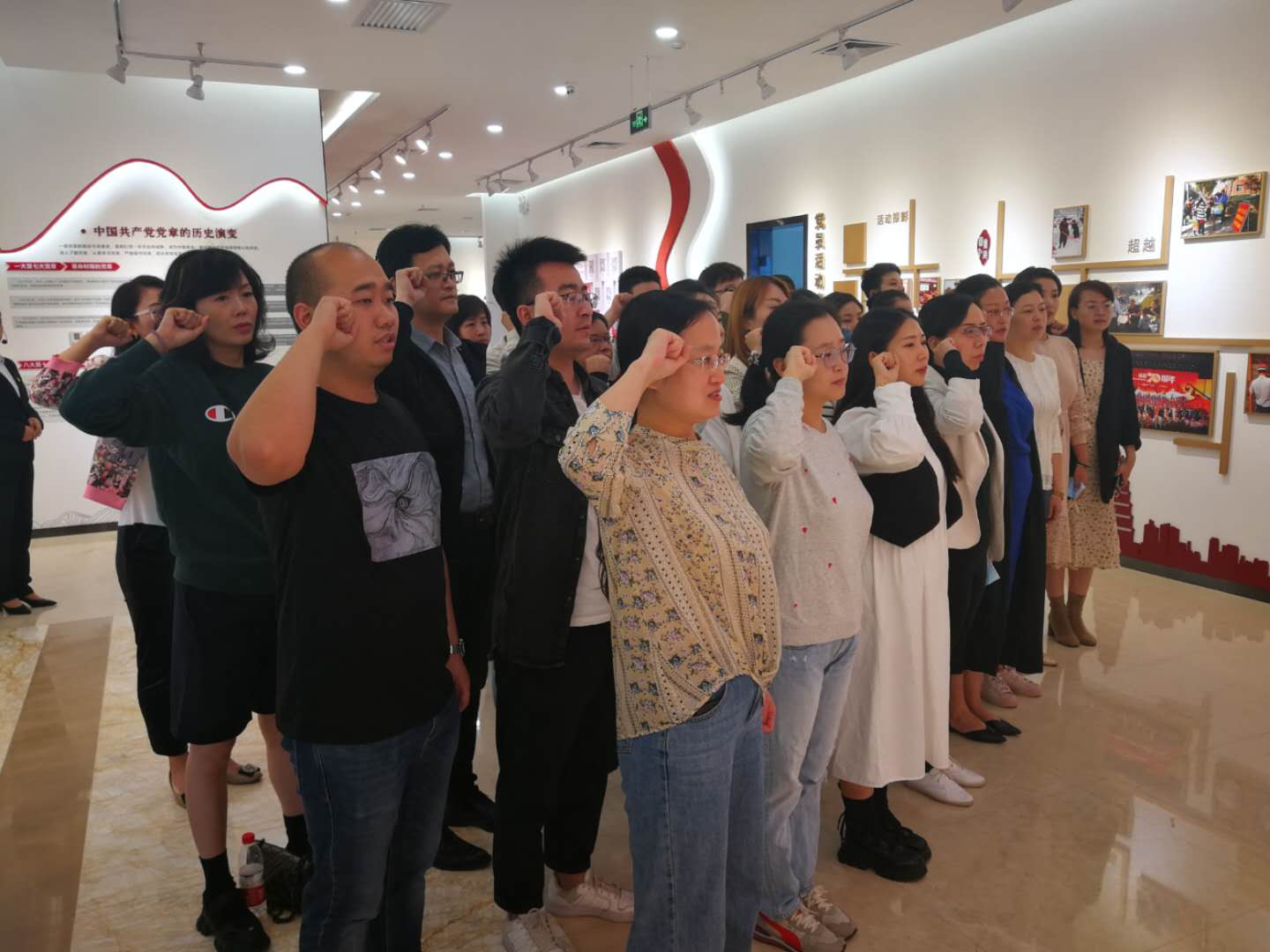 全体党员在正仪镜前郑重地整理衣冠,随后在解说员的带领下来到红色会客厅。“民族根基”版块的内容展示了中国共产党带领全国人民从站起来到富起来再到强起来的近百年波澜壮阔的奋斗史,全体党员深受红色革命意志的感染与熏陶,切身感受到革命先烈艰苦奋斗的精神和力量。