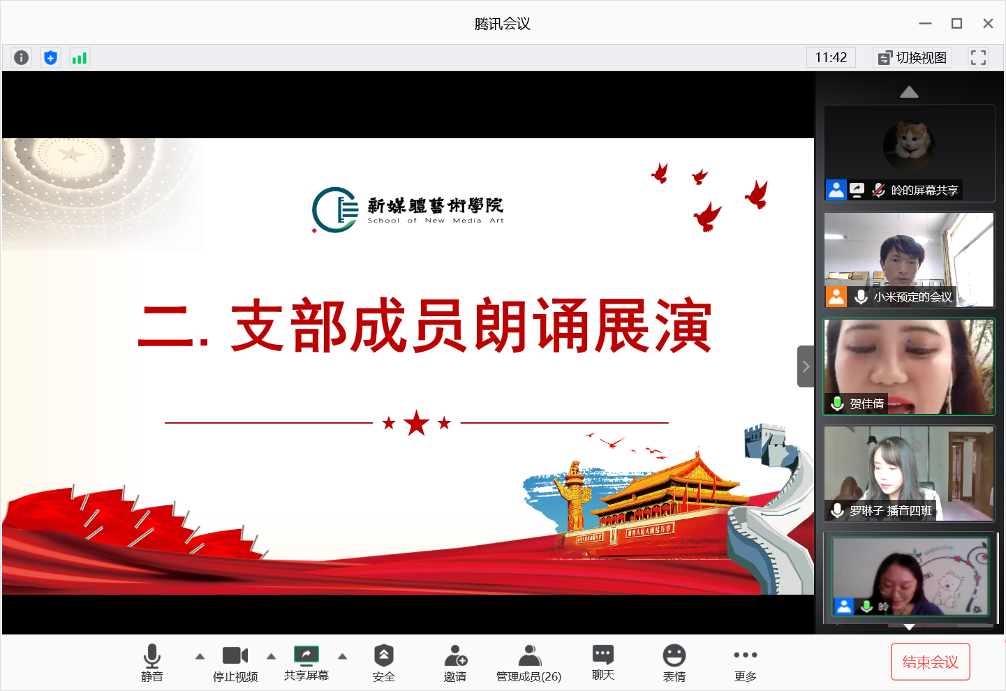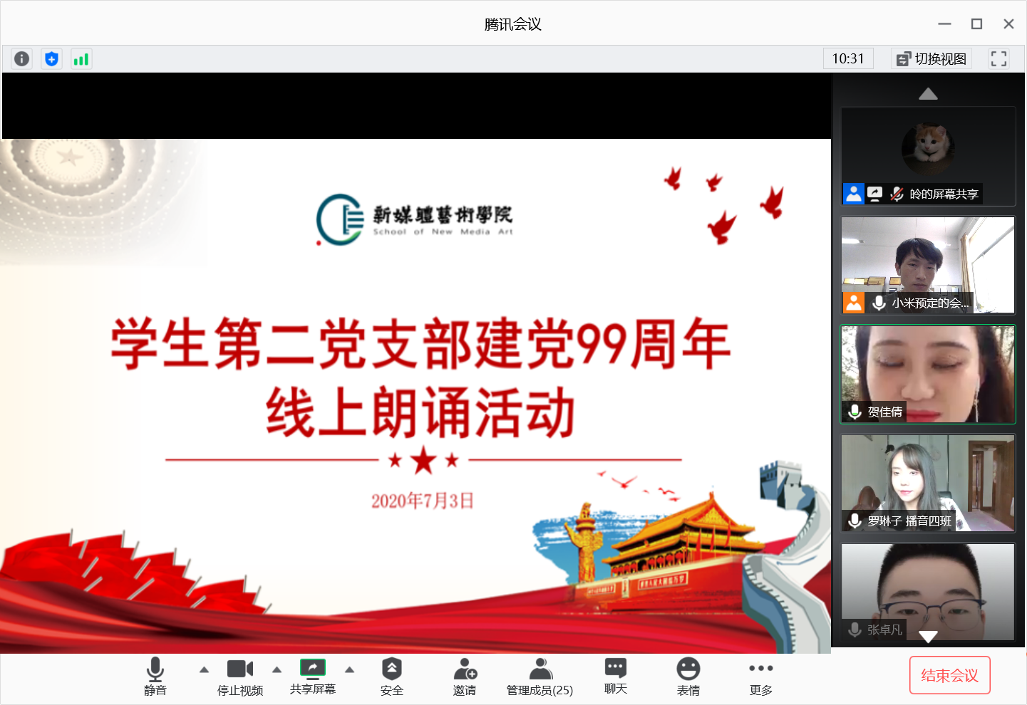 2020年7月3日,米高梅 学生第二党支部通过腾讯会议平台开展“建党99周年”线上主题朗诵活动,会议由支部书记刘东欢主持,支部全体党员参加了此次活动。