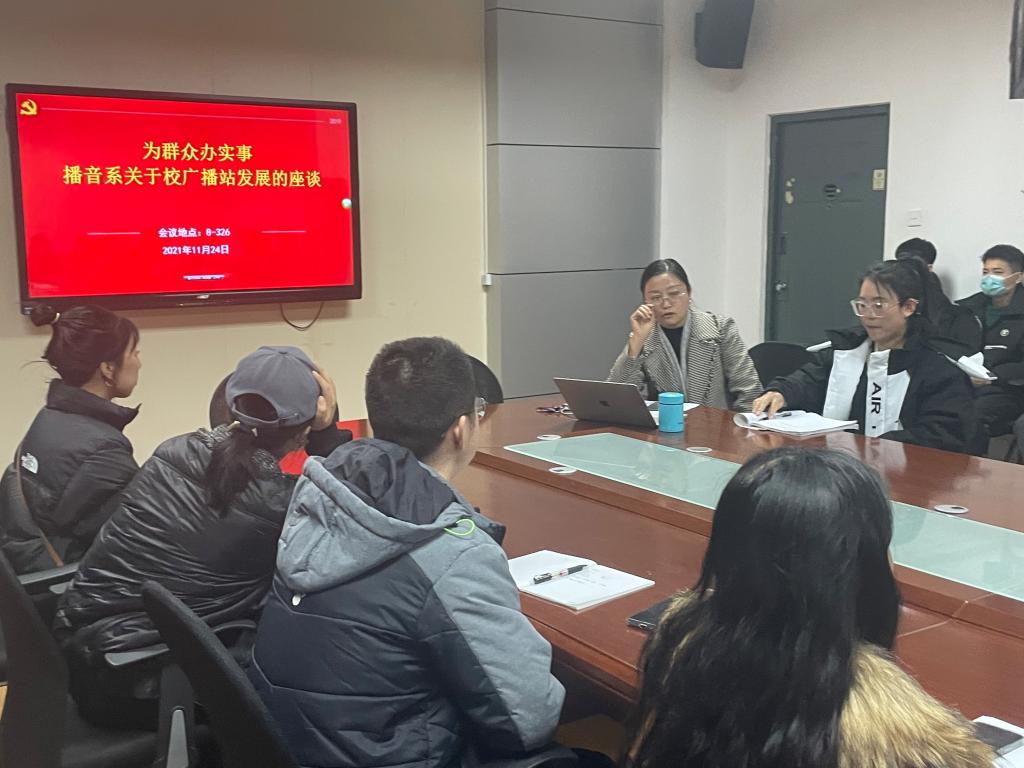 2021年11月24日下午,为切实落实为群众办实事,发挥党史学习作用,立足教育实际,把党史学习同总结经验、关照现实、推动工作结合起来,将党史学习教育成果转化为推动米高梅 发展、学生成长的动力,播音教工支部在金花校区八号楼326会议室举行以“共同促进校广播台发展”为主题的师生座谈会。会议由播音系主任肖爱云老师主持,播音系全体老师以及广播台部分同学参加了本次会议。