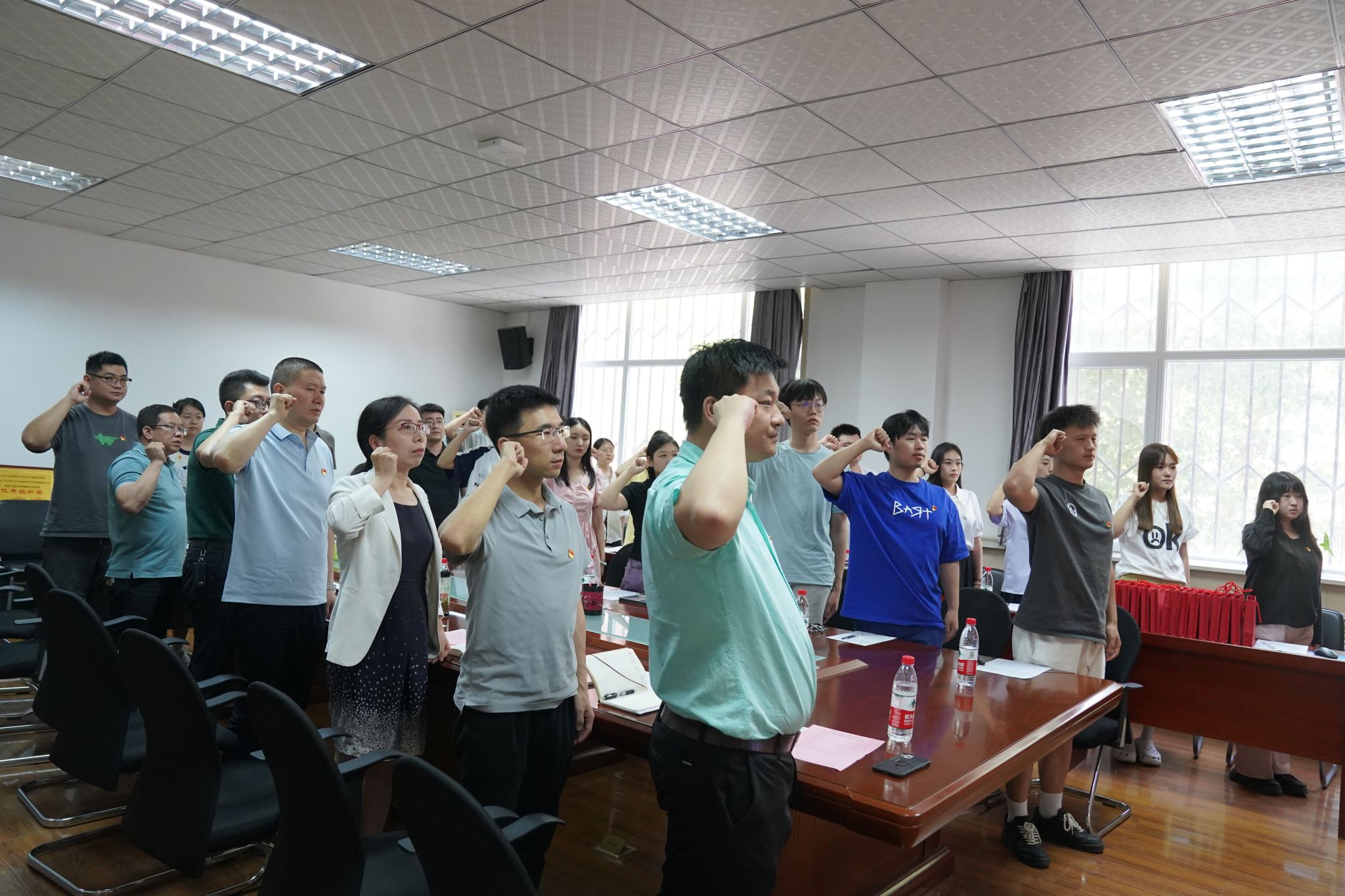 与会师生在领誓人姒晓霞的带领下,面对鲜红的党旗,紧握右拳,庄严肃立,声音洪亮,铿锵有力,重温入党誓词。庄严的宣誓不仅是对党的忠诚和承诺,更是对毕业生们未来人生道路的坚定指引。