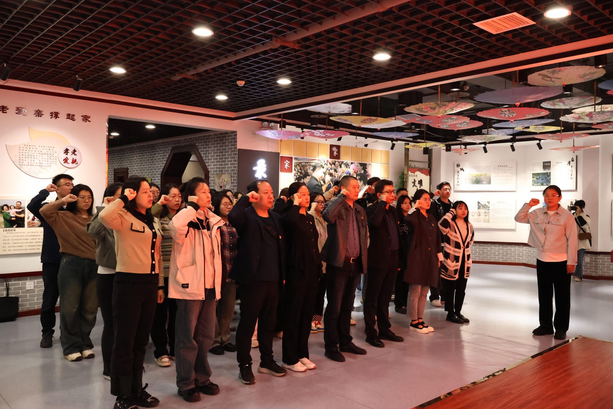 “我志愿加入中国共产党,拥护党的纲领,遵守党的章程……”在家风馆内,全体党员高举右拳,面向党旗庄重宣誓。入党誓词字字千钧、句句铿锵,响彻场馆,这是初心使命的宣誓,更是砥砺奋进的信仰传承。