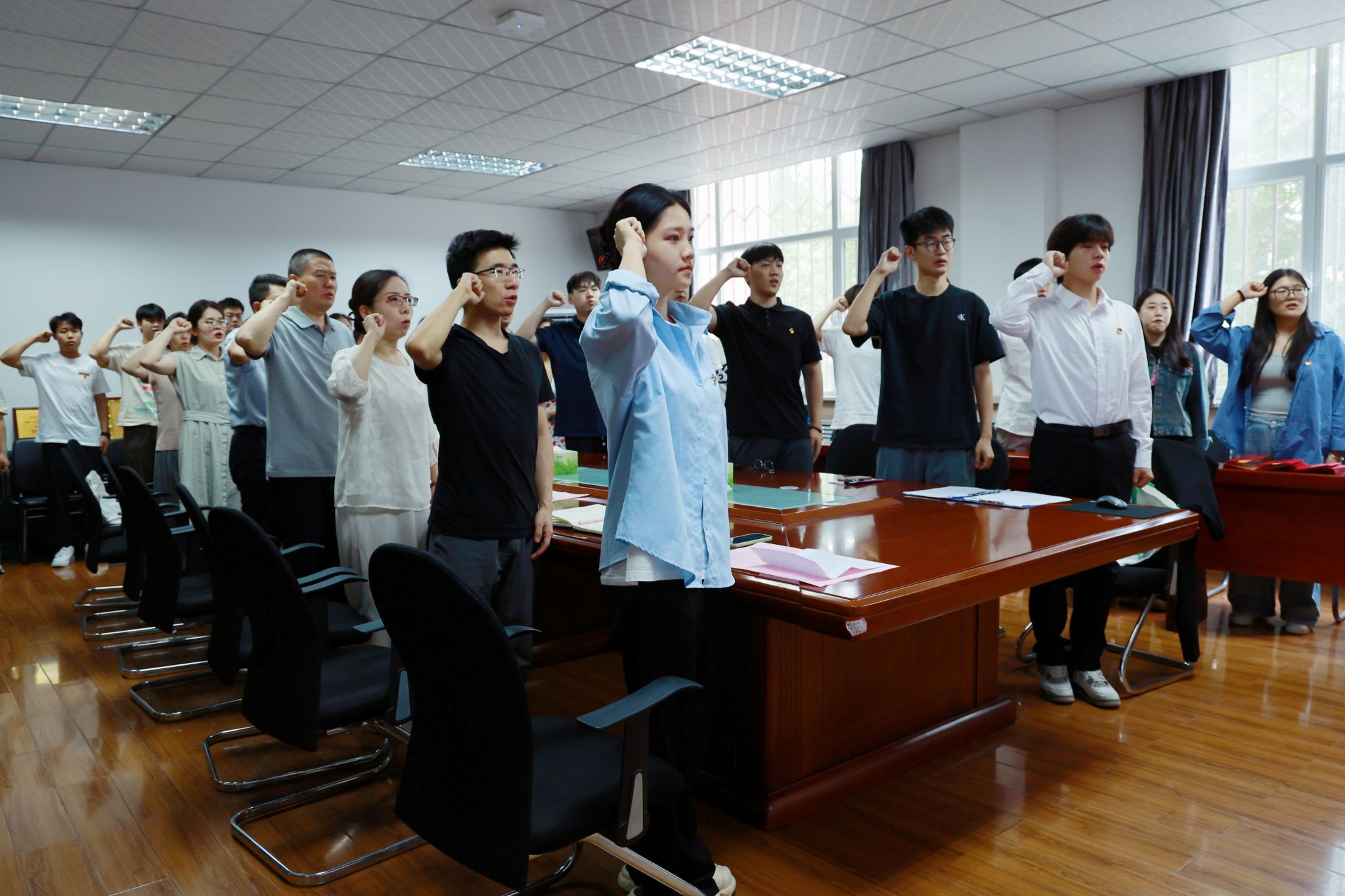 在入党宣誓环节,全体党员面对鲜红的党旗,举起右拳,由校优秀共产党员齐可欣同志领誓,郑重宣誓:“我志愿加入中国共产党……”誓言铿锵有力,表达了党员们对党的忠诚与决心。宣誓结束后,各党支部书记上前为新发展的预备党员佩戴党徽,并赠送了寓意深刻的“政治生日贺卡”,以此鼓励新党员们牢记誓言,坚守初心,勇担使命。