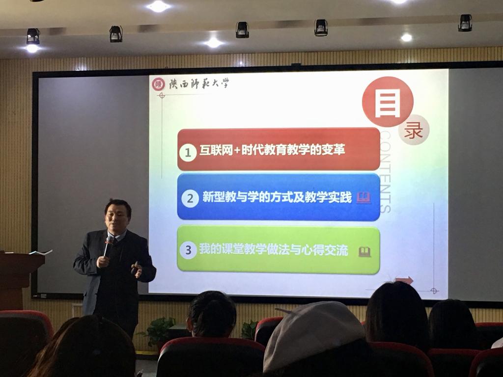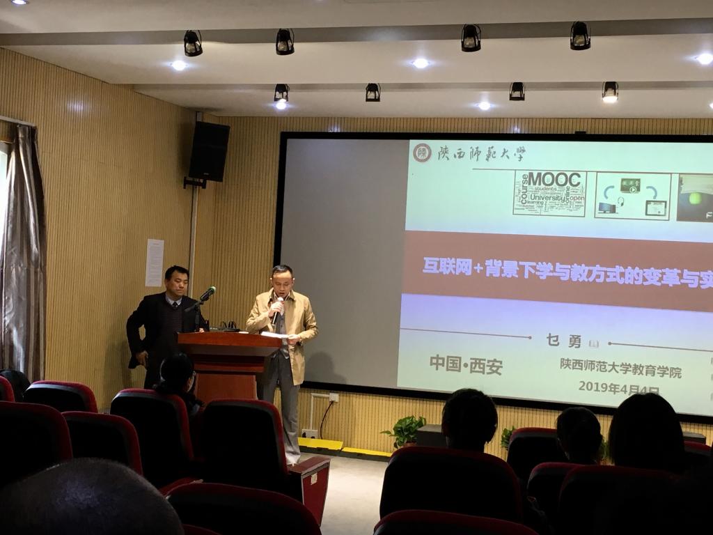 为提高米高梅 教师教学水平,扎实做好“上好一堂课”教学活动,4月4日下午,米高梅 特邀请陕西师范大学教育米高梅 教育技术系主任、教育技术学博士生导师乜勇教授为全体教师带来了《互联网+背景下学与教方式的变革与实践》讲座。