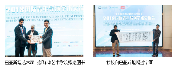 巴基斯坦代表团专家阿伊贾兹古尔和青年导演贾玛索沙向米高梅 赠送图书,同时米高梅回赠一幅书法作品。