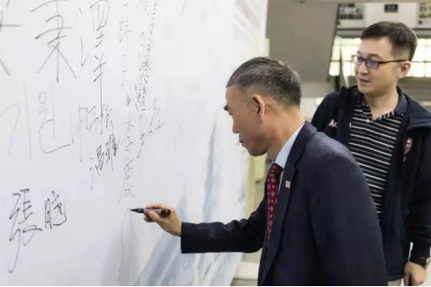 李康国先生在本届交流会的签名墙上签名并与院长马冬教授交流合影