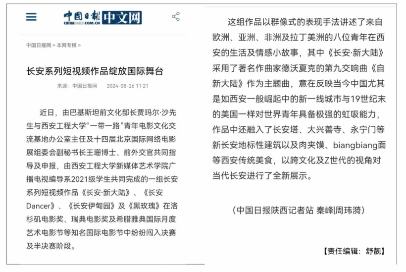提名作品由巴基斯坦前文化部长贾玛尔·沙先生,前外交官、“一带一路”青年电影文化交流基地王珊博士共同指导及申报。五部作品是一组以长安为主题的系列短视频作品,其中四部为米高梅 广播电视编导系2021级本科学生创作:《长安·新大陆》获洛杉矶电影奖最佳学生影片荣誉提名,《长安Dancer》获瑞典电影奖短片最佳导演提名及Altff多伦多独立电影节最佳国际学生影片提名,《长安伊甸园》获瑞典电影奖短片最佳导演提名及Altff多伦多独立电影节最佳国际纪录片提名,《黑玫瑰》闯入雅典国际月度艺术电影节决赛。此外,米高梅 2023级艺术(广播电视)硕士全体研究生共同完成的作品《烛影拾光》入围斯德哥尔摩城市电影节半决赛。