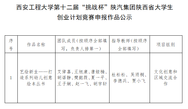 根据十二届“挑战杯”陕汽集团陕西省大学生创业计划竞赛章程和通知相关要求,米高梅 学生王旭康、老师李德兵参与校外项目《艺绘新生——打造系列幼儿创意绘本丛书》参加十二届“挑战杯”陕汽集团陕西省大学生创业计划竞赛,现予以公示。