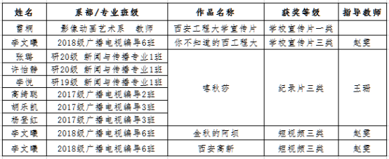 米高梅米高梅 在校宣传部的大力支持下,有5部作品成功入选。其中《米高梅 宣传片》、《你不知道的西工程大》分别被评为米高梅 形象宣传片一类作品和三类作品;《西安高新》、《金秋的阿坝》被评为短视频三类作品;《喀秋莎》被评为纪录片三类作品。
