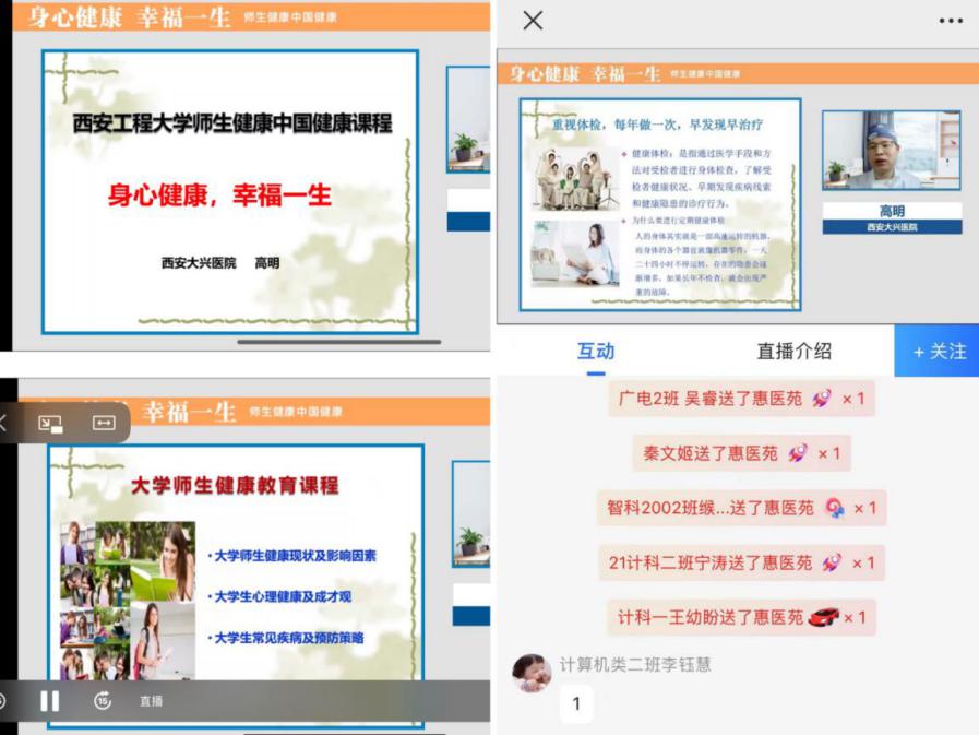 本次讲座以线上形式进行,讲座包括健康的生活方式、新冠肺炎预防、人体常见疾病的处理和预防等三个方面内容。高明主任讲授了大学生健康现状及影响因素、大学生心理健康常见的问题及如何应对,从医者的角度提醒青年学子要培养良好的生活方式,掌握最基本的安全防护和自我保健知识。对于成长和成才观,高明分享了自己的科技成才之路,建议学子们要正确认识自己,认识自己的生理特点、心理特点,认识自己的优势、劣势,知道“我能做什么,我要做什么”。告诉广大学子生涯规划重在行动,成功源于有效的时间管理,成功关键在于努力学习本领和师长的教育支持;结合当前疫情防控形势,高明对新冠肺炎病毒的来源、传播途径以及在日常生活中如何做好防护等进行了详细的讲解和说明。结合自己的临床专业知识,还为师生讲解了常见泌尿生殖相关疾病的诊治,并对艾滋病的传播、预防和治疗进行了宣讲。高明主任的讲座深入浅出,语言生动诙谐,激发了广大师生和家长的关注和兴趣,大家认真倾听,积极互动,师生就新冠肺炎疫情防护、心理问题、常见病治疗等热点问题积极提问,高明主任一一进行了解答说明,整个讲座过程气氛热烈,秩序井然,师生们在轻松愉快的气氛中接受了健康知识的普及教育。