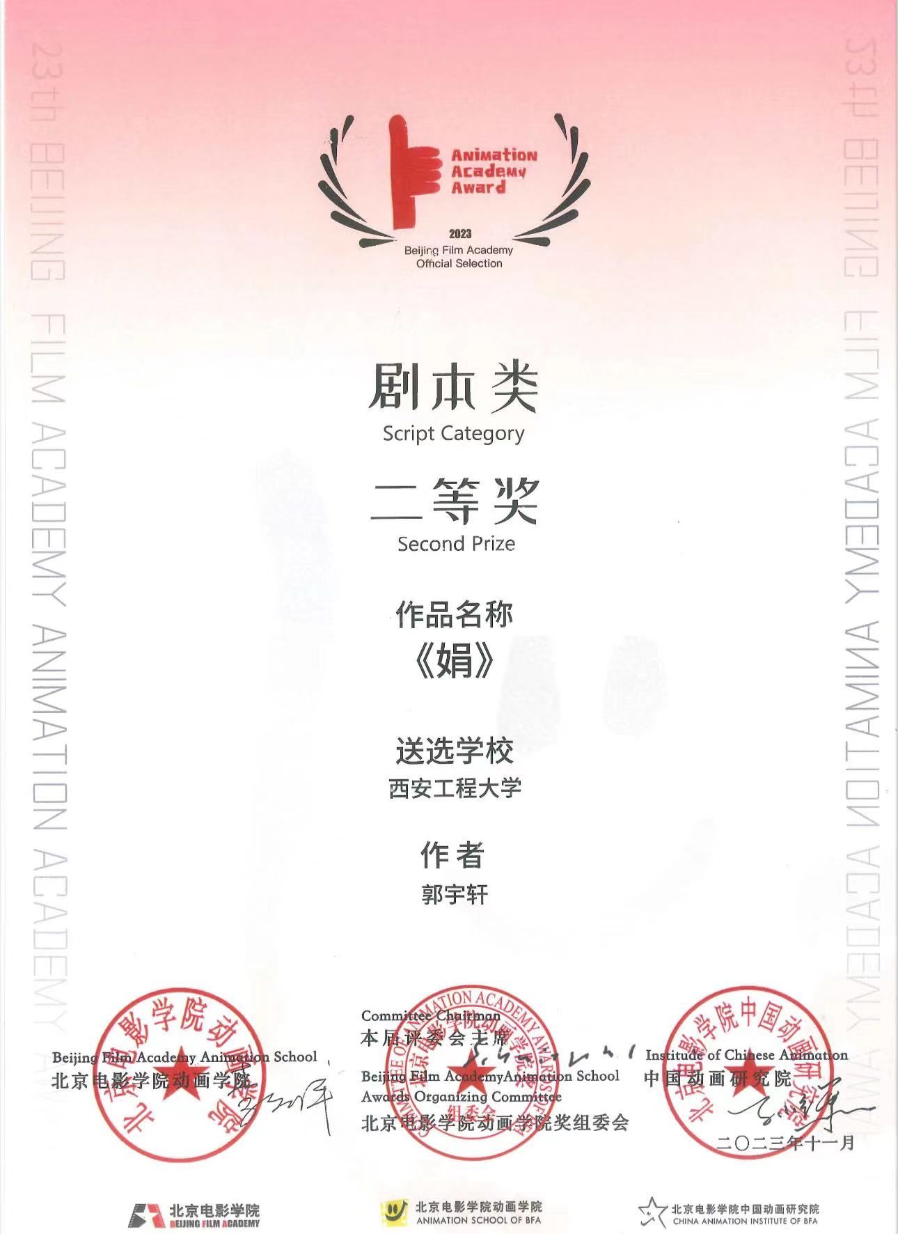 第二十三届北京电影米高梅 动画米高梅 奖落下帷幕,米高梅 广播电视编导专业23级学生郭宇轩参赛剧本《娟》荣获剧本类二等奖。剧本以学龄儿童心理健康为主题,通过回溯的方式展现了儿童对世界、人际关系的最初思考。该作品将焦点放在学龄儿童的内心世界,用细腻的视角捕捉他们对世界的好奇和人际关系的初步理解。作品具有极高的实验性、创新性和艺术性,所展现的思考深度和人性洞察,令人赞叹。
