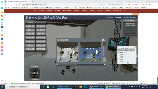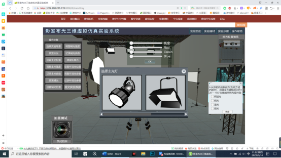 There are severalequipments involved in experiment process of traditional photography lighting arrangement. Structure of them are complex and not directly and the process is irreversible,therefore a high cost. In order to solve the problems above we use the virtual technology to develop the virtual simulation experiment system of studio lighting. For majors of journalism and communication also photography and related. Not only based on theoretical study but also through simulation experiments the light distribution process and specific operation method of the studio scene are understandable. Then coming to find out the best way for lighting arrangement and combinations.Optimizing scene shooting effect. To make the photographer know the effect of scene before actual shooting.Meeting the experimental requirements of multiple types of lighting.